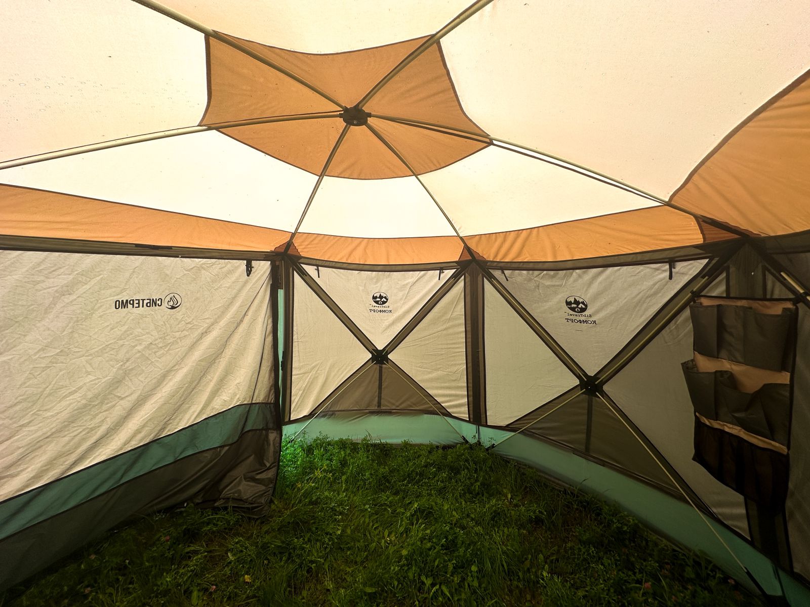 Шатёр оборудован одним большим входом с москитной сеткой в пол. Внешняя ткань тента может использоваться как солнцезащитный козырек благодаря 2 упорам из стеклокомпозитного прутка 12мм которые идут в комплекте. Входная группа может быть закрыта полностью или с поднятым внешним тентом.